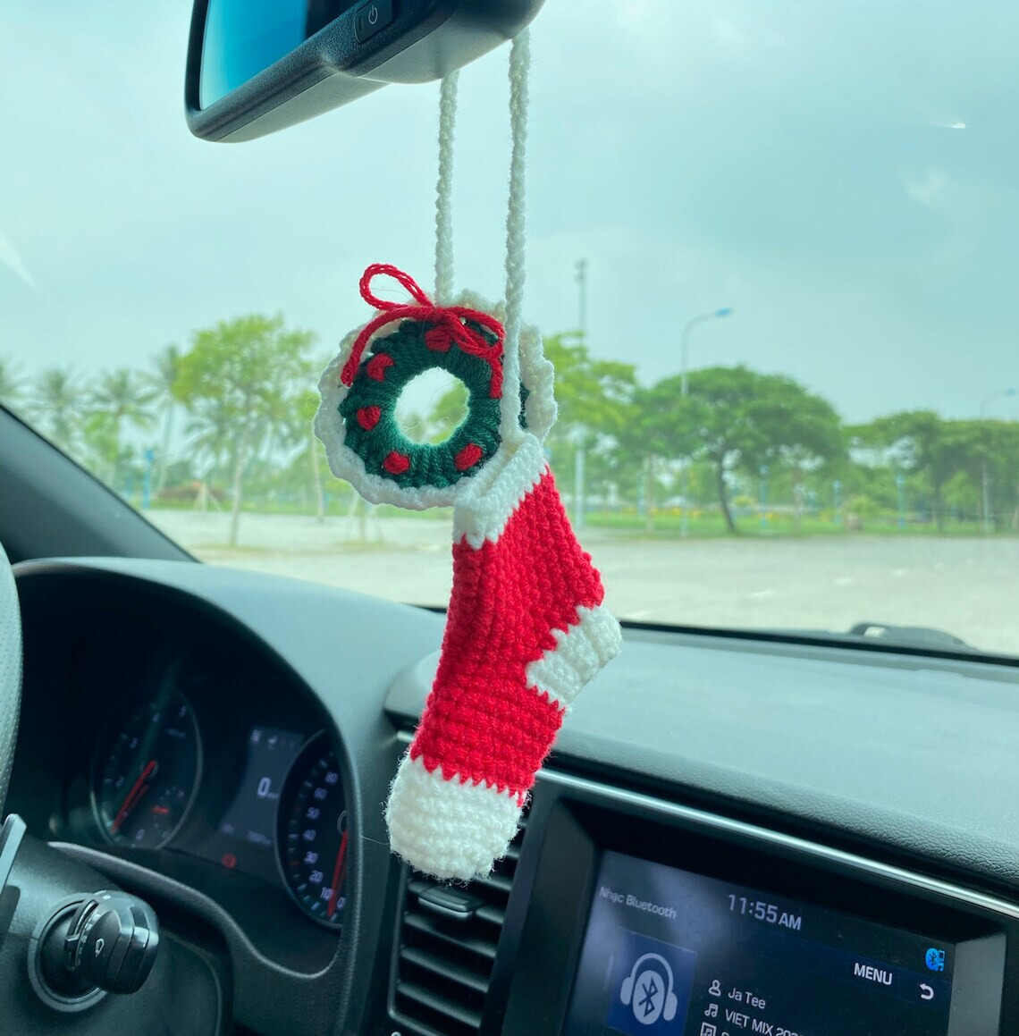 Crochet Christmas Stock And Mini Wreath Car Charm, Cute Christmas Stocking Wreath Rear View Mirror Ornament, Christmas Car Accessories