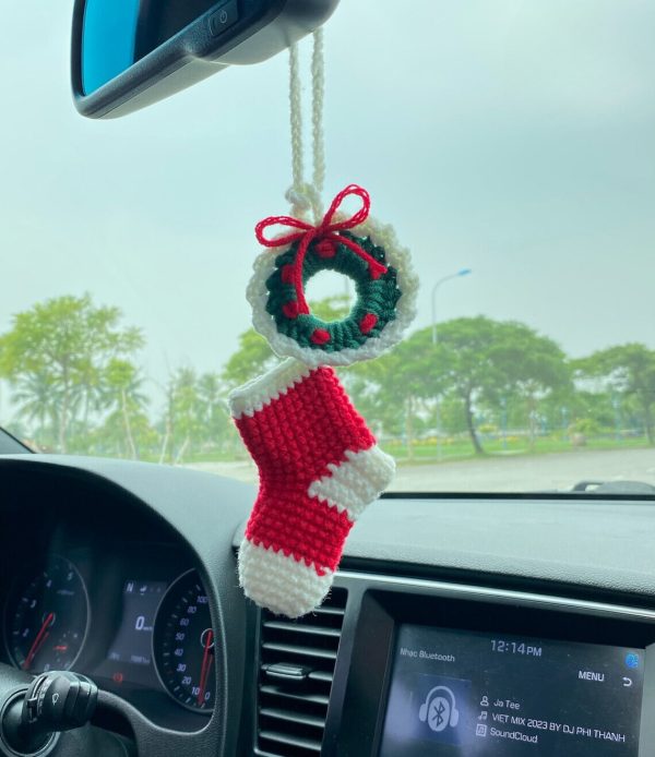Crochet Christmas Stock And Mini Wreath Car Charm, Cute Christmas Stocking Wreath Rear View Mirror Ornament, Christmas Car Accessories