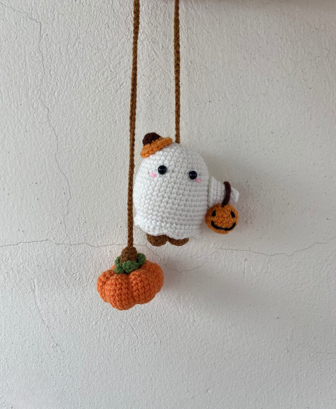 Materials: This cutie ghost holding pumpkin bag car pendant is crocheted with natural cotton yarn, soft for skin, safe eyes.